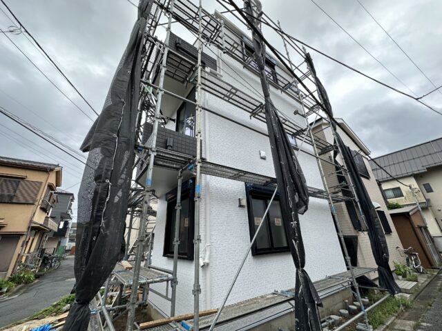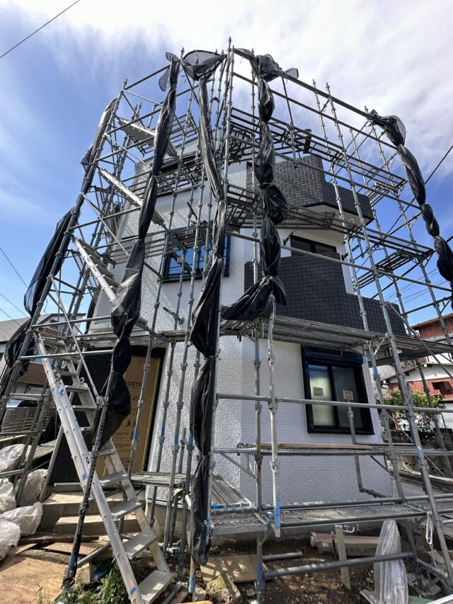 皆様こんにちは。今日は東京都江戸川区の新築物件の現場に来ています。現場では足場か取り外されて内装工事でクロスの張り付けが進められているところです。 …
