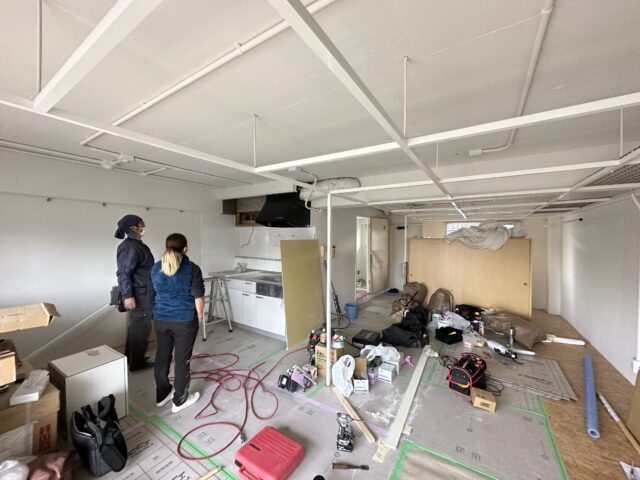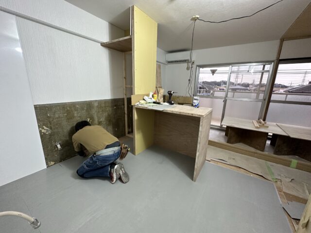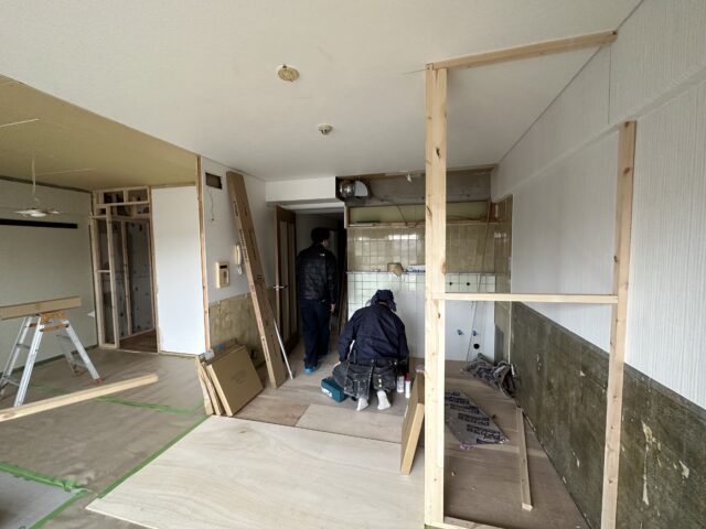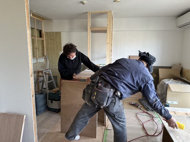 皆様こんにちは。今日は神奈川県川崎市のマンションリノベーションの工事現場に来ています。現場では木工事中心に造作キッチンの施工作業が行われています。 ※当該物件は先にR不動産にて入居者様と不動産オ…